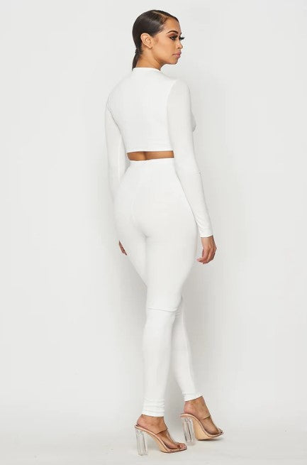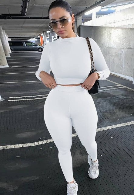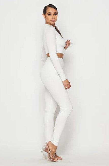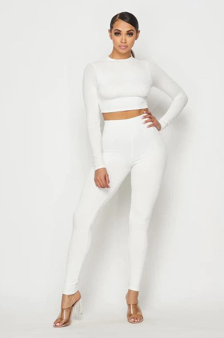 Long Sleeve Crop Top Matching Leggings Double Layered/Lined, Stretchy Material. A refined addition to any wardrobe, this set pairs sublime comfort with timeless style for a look that will take you from casual lounging to elegant evenings with ease.