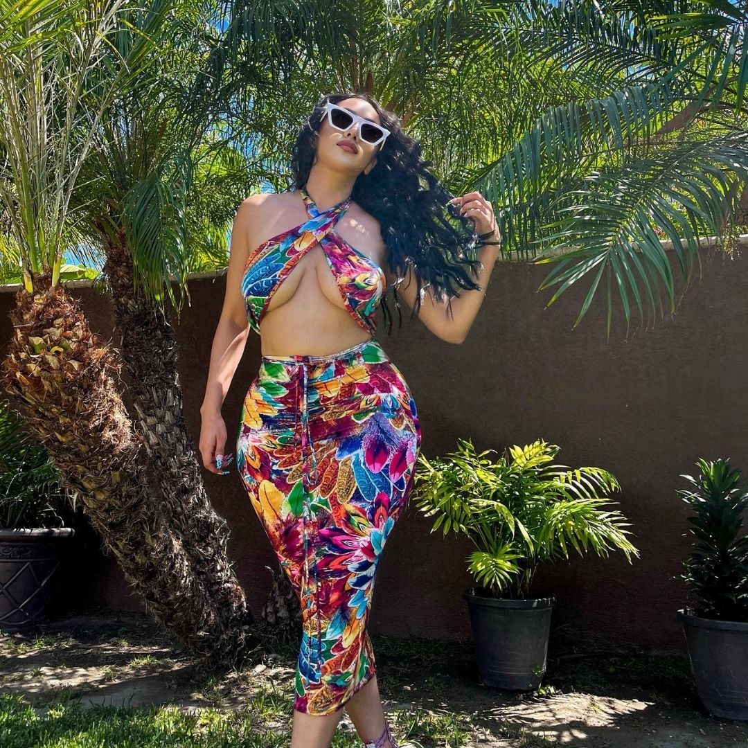 This two piece set features a halter crop top paired with a high waisted skirt. you can adjust to your waist. Both pieces have cutout detailing and are secured with self ties. The skirt is ruched and has no closure for a sleek look. Model is wearing a size medium.