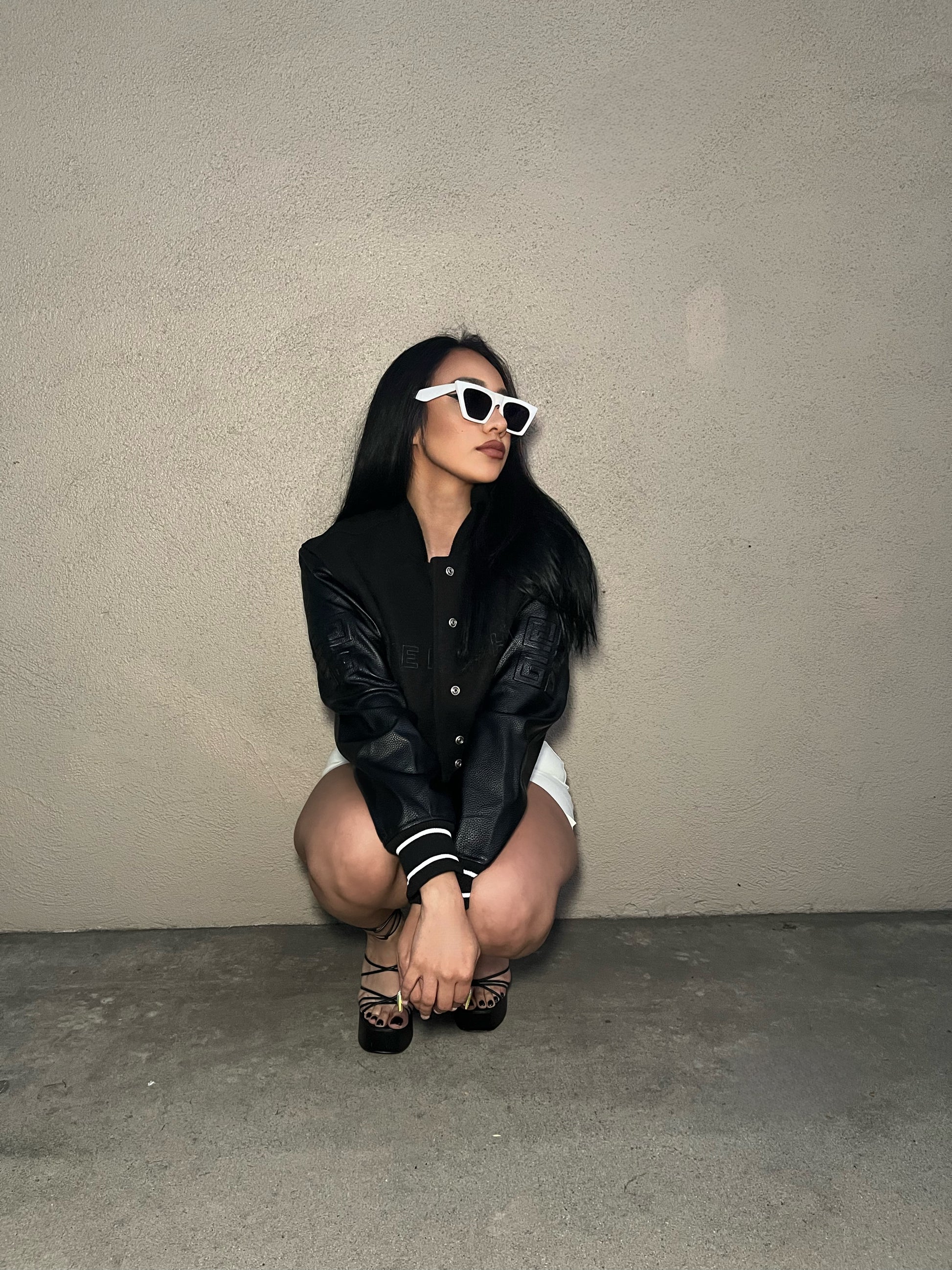 Black faux leather baseball jacket. With details on both sides of sleeves.