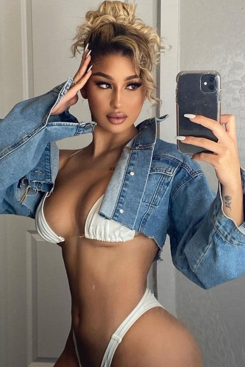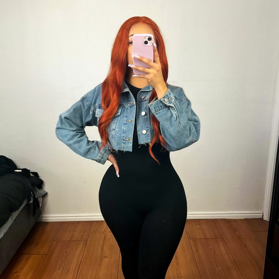 Snag this loose-fitting jean jacket, cropped to perfection. Our model is rocking a small for reference (and looking fab!).
