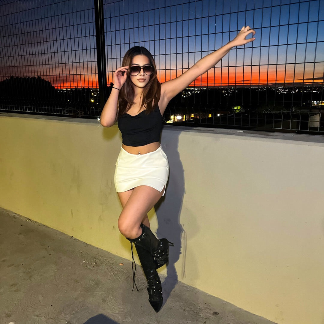 This stunning Skirt features a side slit, elastic waistband, and mini fit crafted from luxurious faux leather with slight stretch for the ultimate blend of style and comfort. Model is wearing a small.